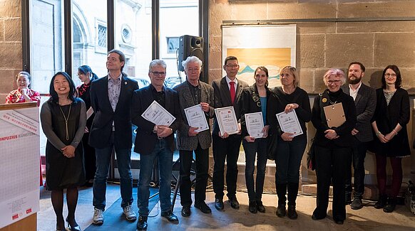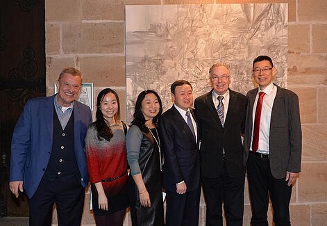 Dr. Andrea Dippel, Leiterin der Kunstvilla im KunstKulturQuartier; Peter Kampehl, Künstler; Prof. Dr. Michael Lackner, Inhaber des Lehrstuhls für Sinologie an der Friedrich-Alexander-Universität; Thomas May, Künstler und Kurator der Ausstellung; Dr. Norbert Schürgers, Leiter des Amtes für Internationale Beziehungen der Stadt Nürnberg; Dr. Yan Xu-Lackner, Direktorin des Konfuzius-Instituts Nürnberg-Erlangen