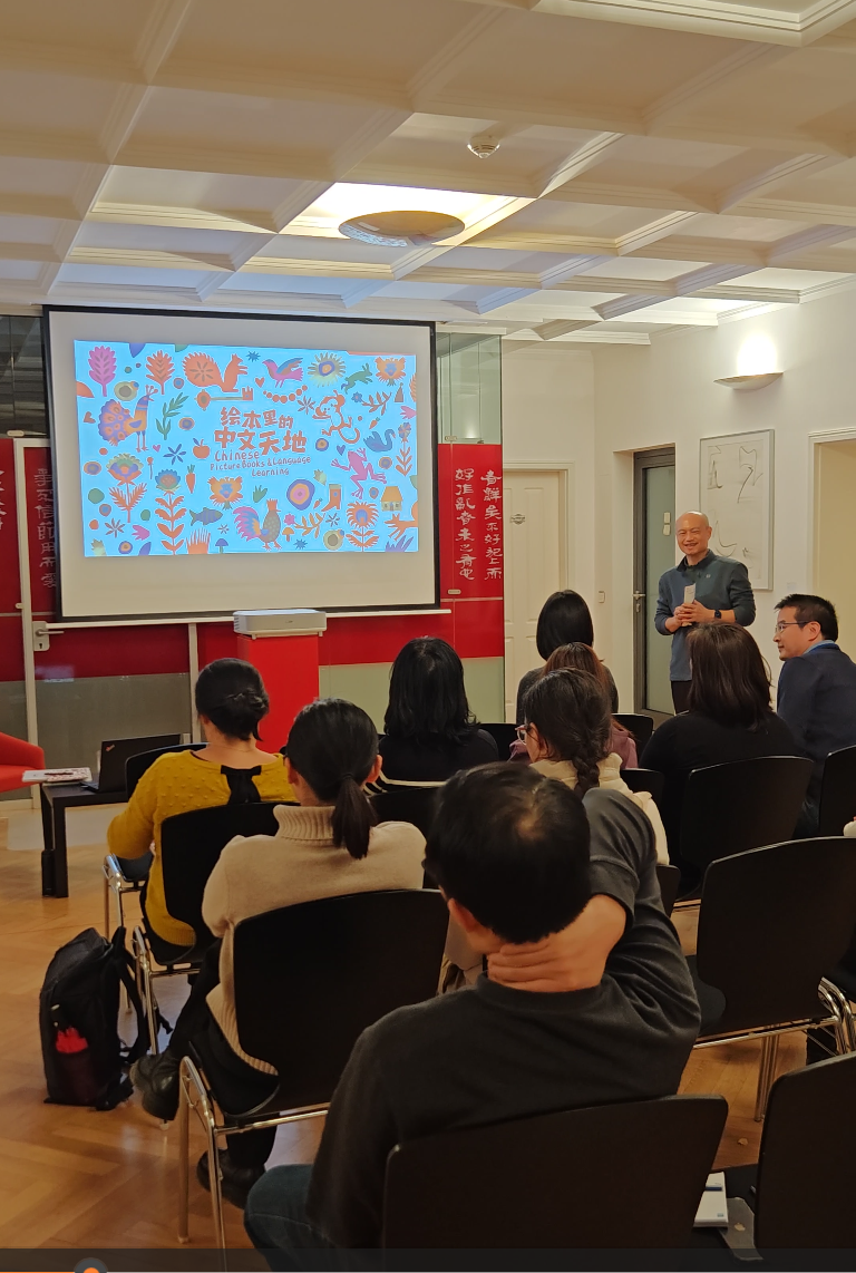Anschließend teilte der Kinderbuchautor seine Erfahrungen aus der Sprach- und Leseförderung. Er betonte den besonderen Wert chinesischer Originalbilderbücher im internationalen Chinesischunterricht – vor allem für den Einstieg. Solche Bücher faszinieren mit bunten Illustrationen und regen mit spannenden Geschichten die Neugier der Kinder an. Wichtig sei dabei auch die Rolle der Eltern: Sie sollten beim Vorlesen kreativ sein und die Geschichten lebendig erzählen. So könne die Musikalität und der Charme der chinesischen Sprache direkt erlebbar werden.