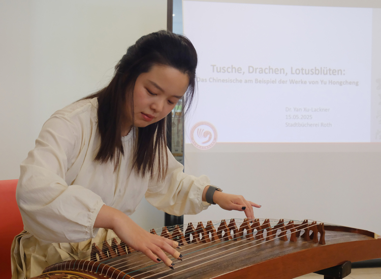 Zur Ausstellungseröffnung am Nachmittag des 15. Mai hat eine Künstlerin vor Ort live für die Gäste gemalt. Ein Vortrag von Dr. Yan Xu-Lackner mit dem Titel „Tusche, Drachen, Lotusblüte: Chinesische Elemente am Beispiel der Werke von Yu Hongcheng“ sowie ein musikalisches Rahmenprogramm rundeten die Vernissage ab.