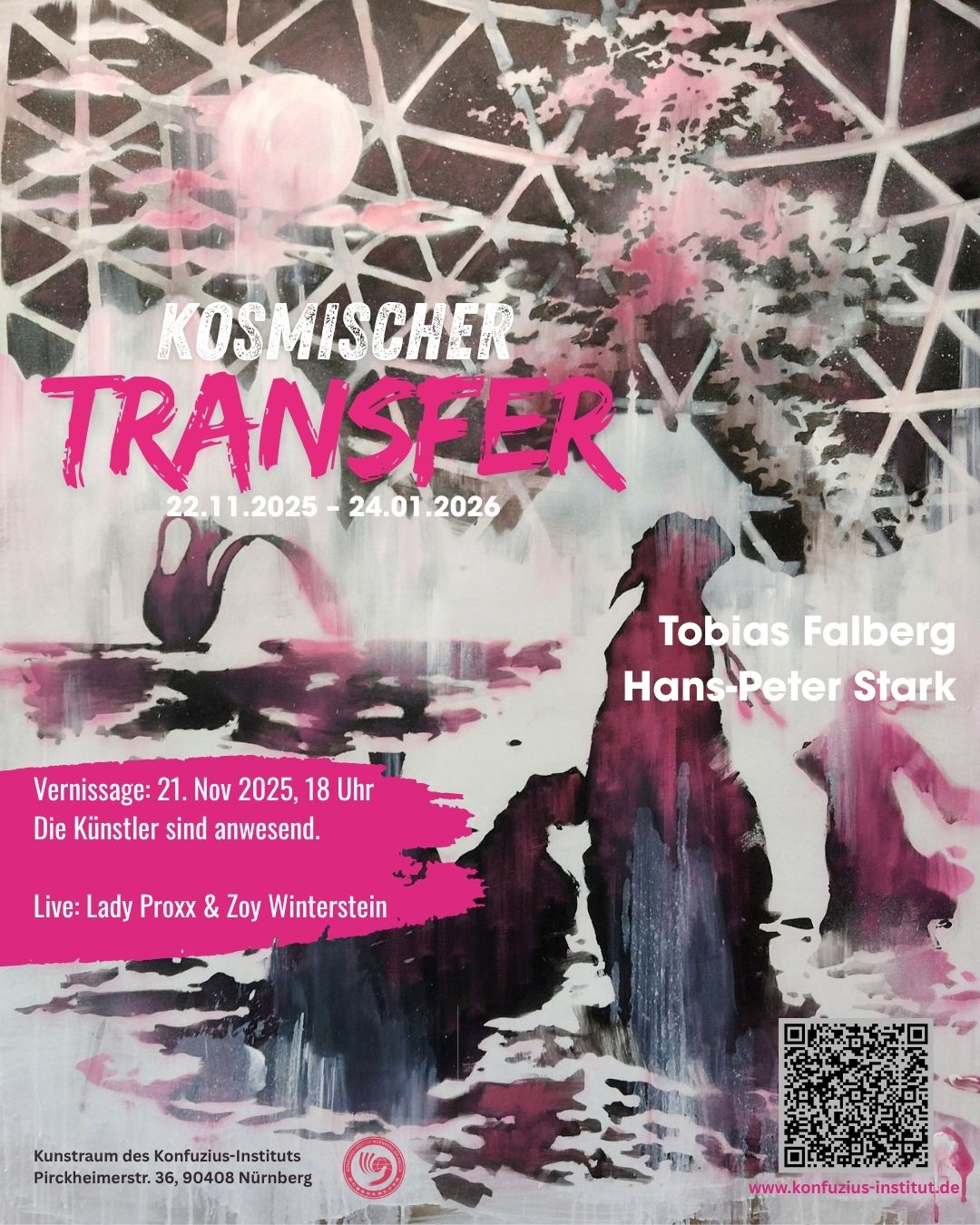 Am Freitag, 21. November, wird in unserem Kunstraum die neue Ausstellung „Kosmischer Transfer: Tobias Falberg & Hans-Peter Stark“ eröffnet. Beide Künstler werden bei der Vernissage anwesend sein, außerdem erwartet Sie eine besondere Sound-Performance von LADY PROXX & ZOY WINTERSTEIN.