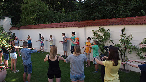 Chinesischlehrerin Xun Jiayue ging anschließend mit den Schülern in den Garten des Konfuzius-Instituts wo ein sportliches Training auf dem Programm stand. Denn nicht nur frische Luft tut gut, sondern auch Bewegung. Xun Jiayue erklärte Wuqinxi - ein gymnastisches Bewegungssystem, welches zu den alten Formen des Qigongs zählt. Ziel ist es, das Tier und dessen Wesen selbst zu verstehen und dies in den Bewegungen zum Ausdruck zu bringen. Hier demonstrierte sie die verschiedenen Bewegungen der Tiere. Großes Gelächter brach beim Nachahmen der Tiere aus. Doch mit viel Freude und Spaß interpretierten die Schüler die lustigen Gesten des Affen, ahmten einen laufenden Hirsch oder einen fliegenden Vogel nach oder gaben das Wiehern des Pferdes wieder.