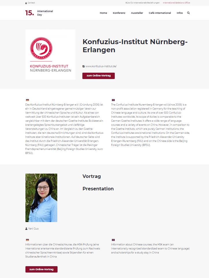 Die WiSo-Fakultät der Friedrich-Alexander-Universität organisiert jedes Jahr einen „International Day“, um Studierende auf einen Auslandsaufenthalt vorzubereiten. Aufgrund der aktuellen Pandemiesituation gab es in diesem Jahr am 10. November den ersten virtuellen International Day mit vielen praktischen Tipps, Infos und Expertenvorträgen für die Studierenden. Wie in den letzten Jahren beteiligte sich auch das Konfuzius-Institut Nürnberg-Erlangen: Unsere Sprachbereichsleiterin Yani Guo bot einen Online-Vortrag an und erläuterte das Angebot des Konfuzius-Instituts, wie Chinesischkurse, die HSK-Prüfung (die international anerkannte standardisierte Prüfung zum Nachweis chinesischer Sprachkenntnisse) sowie Stipendien für einen Studienaufenthalt in China.