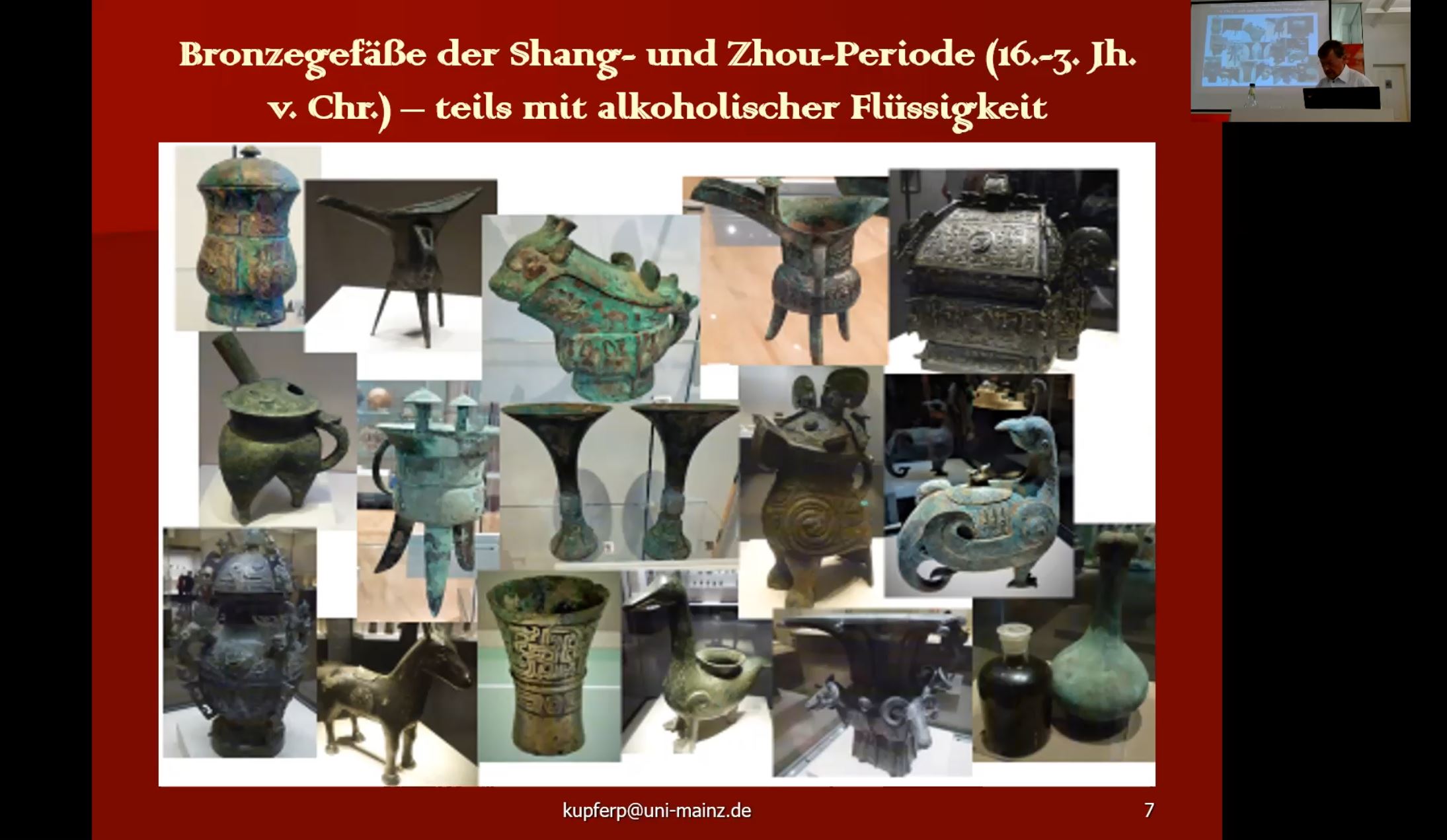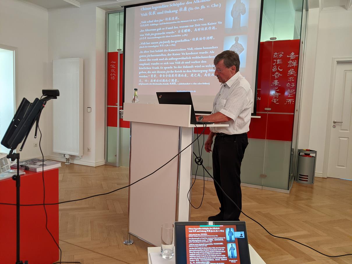 Der Vortrag beleuchtete einführend die zentrale Rolle des Alkohols (酒 jiu) in der chinesischen Philosophie und Geistesgeschichte, wobei sich dessen Symbolik auch in der Sprache und Schrift widerspiegelt. Seit Jahrtausenden dominiert Alkohol das spirituell-religiöse und gesellschaftlich-wirtschaftliche Leben im chinesischen Kulturkreis. Während der Shang- und Zhou-Dynastien (16.-3. Jh. v. Chr.) hat sich ein überaus komplexes Opfer- und Trinkzeremoniell entwickelt, das in seiner konfuzianischen Ausprägung ein einzigartiges und bis in die Gegenwart hineinwirkendes Ritualsystem hervorgebracht hat. Bereits lange davor gibt es Zeugnisse für den Austausch der verschiedenen eurasischen Alkoholkulturen. Nach einer Vorstellung der ins 3. Jahrtausend v. Chr. zurückreichenden Schöpfungsmythen, der wichtigsten prähistorischen und antiken alkoholischen Getränke sowie der hochkomplexen 麴 qu-Fermentationstechnologie wurden die von einem neuen Humanismus geprägten konfuzianischen Prinzipien der „Trinktugend“ (酒德 jiude) und der individuellen ethischen Verantwortung beim Alkoholgenuss behandelt. Abschließend warf Prof. Kupfer einen Seitenblick auf die Funktion des Alkohols im Daoismus als dionysische Antithese zur konfuzianischen Orthodoxie.