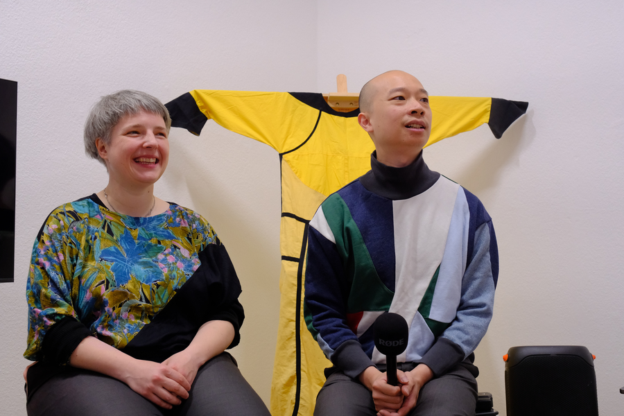 Das in Berlin ansässige Künstlerduo Marta Stanisława Sala (*1985 in Kattowitz) und Cheong Kin Man (*1987 in Macau) verbindet in ihrer Praxis seit 2021 Textil und Text. Als Reaktion auf die Pandemie begann ihre Zusammenarbeit in dem Gemeinschaftsprojekt „Arbeitspause im Görli – Künstlerische Beziehungssysteme im öffentlichen Raum“ (2021), wo sie ideografisches Schreiben und Textil zusammenbrachten.